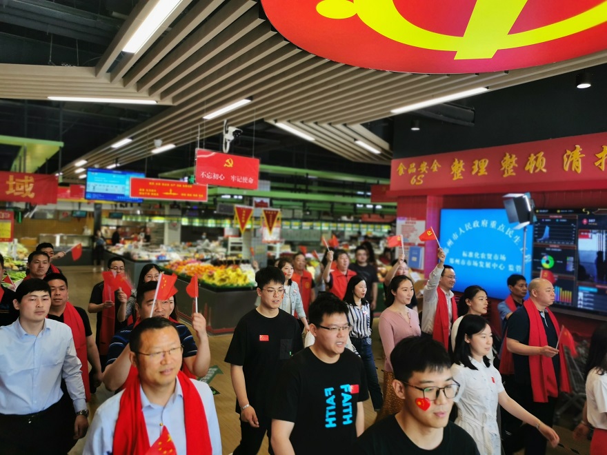 ? ? ? 上午9時,伴隨著悠揚的音樂聲,公司員工一邊揮舞著手中的黨旗,一邊放聲歌唱,緩緩從喧鬧的市場中走出,一場持續(xù)約6分鐘的紅歌“快閃”活動讓濃濃的愛黨愛國情愫涌動在每個人的心里?;顒蝇F(xiàn)場,在音樂旋律的感染下,前來購物的市民以及市場商戶也從四面八方匯聚而來,有的掏出手機拍照,有的一起參與,深情的歌聲漸漸演變成大合唱,所有人用慷慨激昂、精神飽滿的歌聲表達出對偉大中國共產(chǎn)黨的真誠歌頌。大家用紅色的海洋、激昂的情感、高亢的歌聲,展現(xiàn)著新時代共產(chǎn)黨員的風采。